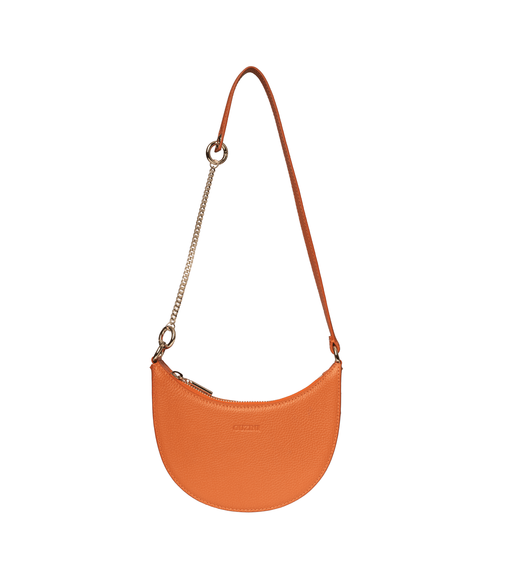 This innovative convertible crossbody bag seamlessly transforms your carrying style with its sophisticated dual-strap system. The eye-catching design features a luxurious leather shoulder strap paired with a detachable gold-tone chain segment that effortlessly clips on and off, allowing you to switch between crossbody and shoulder bag styles in seconds. Crafted from premium genuine leather with a distinctive pebbled texture, the crescent-shaped silhouette offers both style and substance. The spacious interior includes thoughtful organization with interior pockets to keep your essentials secure and accessible. When not in use, the striking chain detail doubles as a chic fashion accessory, making this piece as versatile as your lifestyle. The robust gold-tone hardware and precise stitching ensure lasting durability, while the ergonomic design provides comfortable wear throughout your day, whether you're running errands or enjoying an evening out.